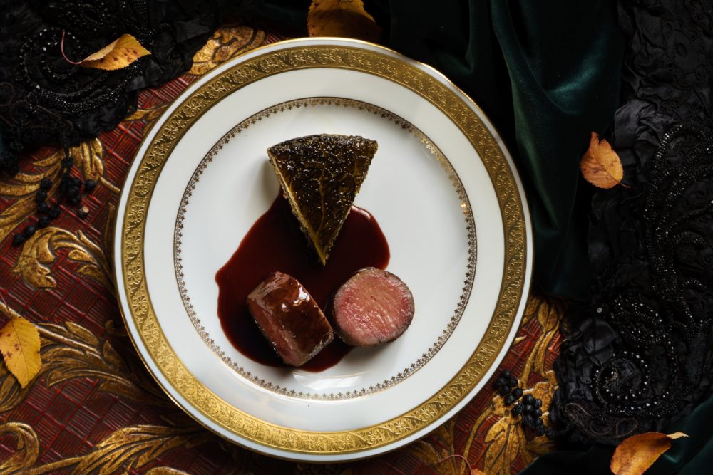 Retirez les aponévroses du filet de sanglier, assaisonnez-le généreusement de poivre, salez puis ficelez-le. Faites-le rôtir au beurre en utilisant une sonde. Arrosez-le continuellement de beurre moussant et arrêtez la cuisson lorsqu’il atteint 58°C à cœur. Laissez-le reposer hors du feu jusqu’à ce que sa température atteigne 60°C.
