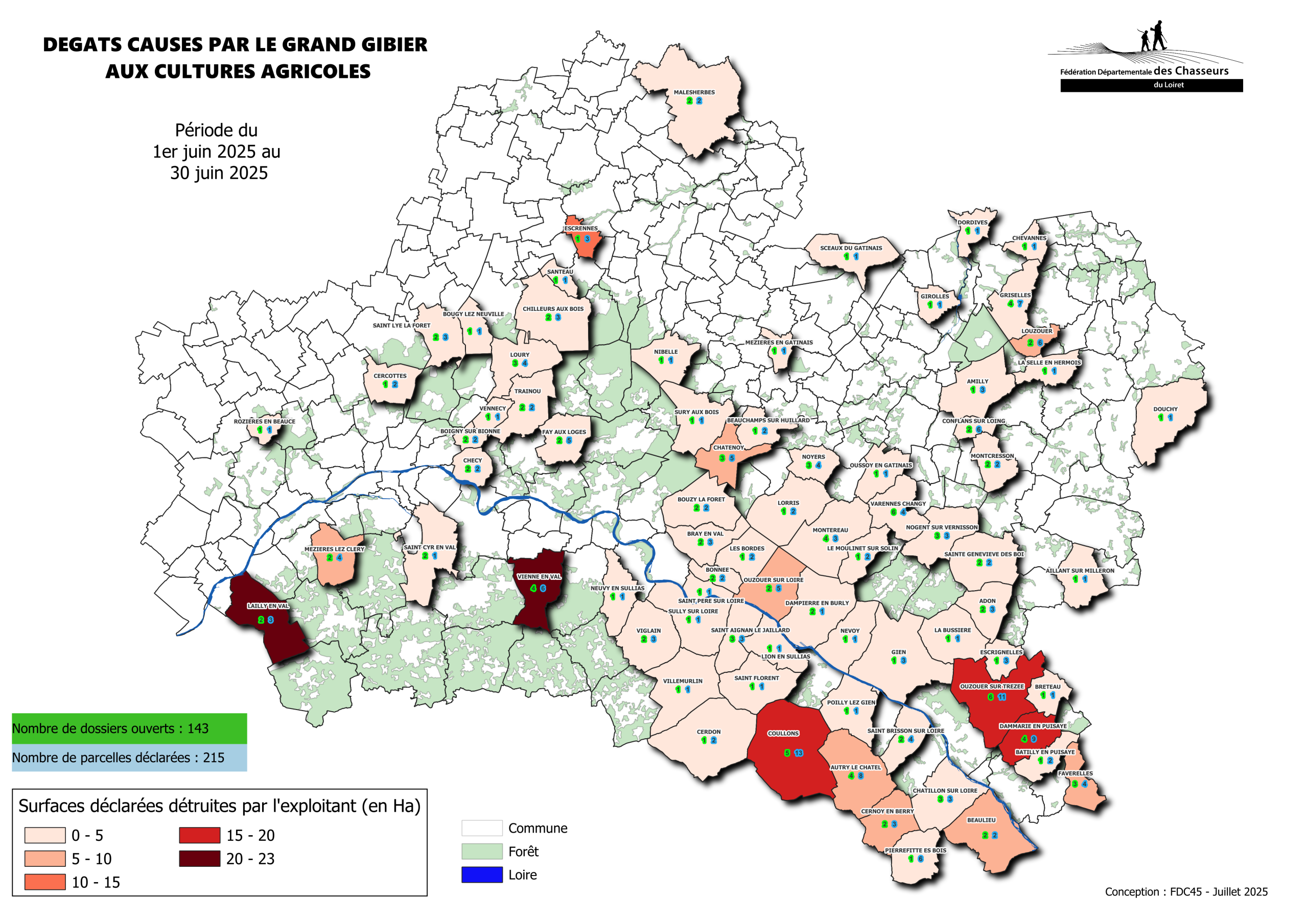 Cette carte indique à l’échelle communale le nombre de déclarations de dégâts faites ainsi que les surfaces déclarées détruites par les exploitants, avant même que les estimations aient été faites, ceci afin de permettre une meilleure réaction des détenteurs et limiter l’aggravation des dommages sur les secteurs impactés.