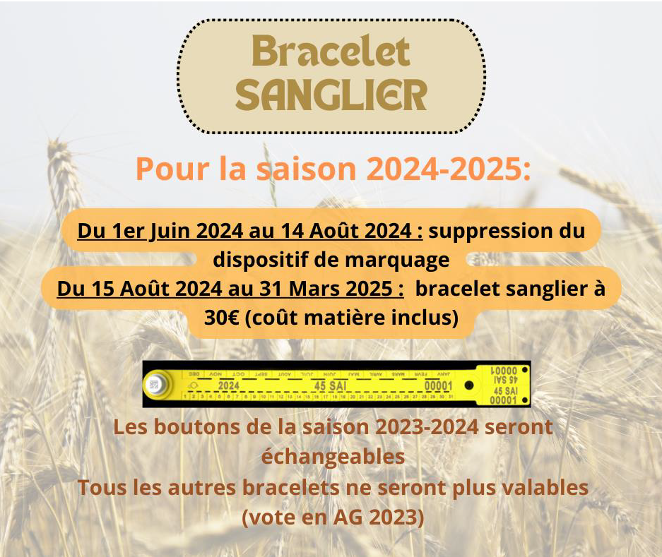 Suite au vote effectué à l’Assemblée Générale de la Fédération des Chasseurs du Loiret, le prix du bracelet sanglier reste à 30€. Cependant, le dispositif de marquage sera remplacé par un bracelet. Les boutons orange de la saison 2023-2024 seront échangeables lors de 5 réunions :